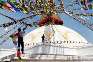 The abundance of prayer flags on the top of this image immediately grab the attention and pull it to the apex of the stupa (a Buddhist monument). Once there, the eye is pulled downward by the pair of prayer flags being strung by the boy at center. Next, the more prominent worker in the front left catches the viewer’s attention and then returns the eye to the top by way of his prayer flags.