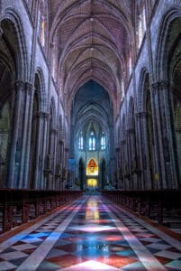 This image has strong lines from every edge pulling your eye toward the alter. More subtly, the curves on the ceiling and even the light on the center aisle also direct your eye to the center.