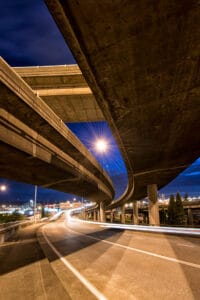 A leading line doesn’t always have to be direct. Using s-curves is an effective way to draw the eye back and forth through an image. Here the highway on top pulls the viewer from left to right and then back again to meet the lower highway. After being returned to the front of the image by the lower highway, the strong shadows draw the eye back to the top highway. Diagonal lines within an image create a much stronger presence than just horizontal or vertical lines. You can use diagonals throughout your image to create a much more engaging composition.