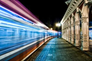 Here the train pulls the eye from left to right with strong lines and strong contrasting colors. Once your eye hits the end of the train, the columns along with their shadows return the eye to the front of the image, and eventually the train. This takes the leading line and makes it into a circular pattern, keeping the viewer engaged in your image.